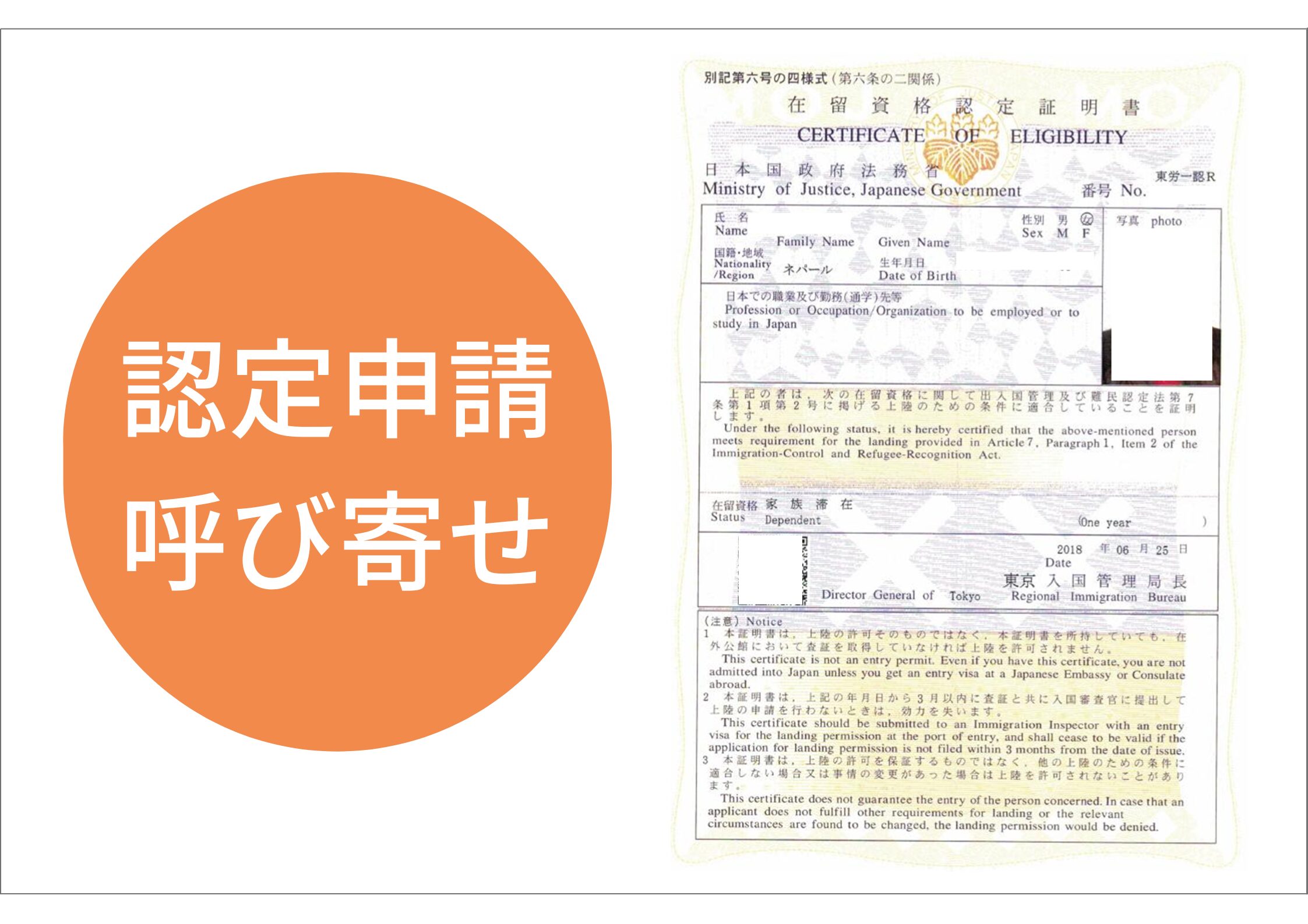 認定申請は在留資格認定証明書が届きます。一方、変更申請・更新申請の場合は許可ハガキが届きます。在留資格認定証明書は本国に送っていただき、各国日本領事館で査証発行後、来日された時に空港で在留カードがもらえます。変更申請・更新申請の場合は新しい在留カードを取得することにより家族滞在ビザの手続きが完了となります。