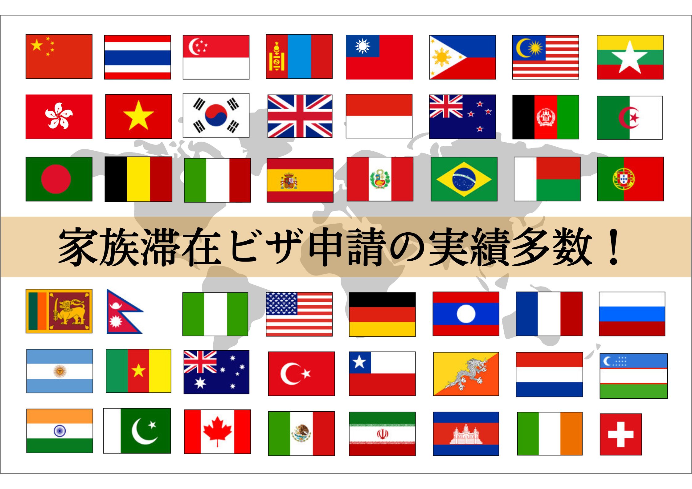 国際業務に特化し業務を行ってきたため、アジア、ヨーロッパ、北中米、南米、アフリカ、オセアニアなど豊富な実績がございます。これまでにたくさんの家族滞在ビザ申請を行ってきたため、全国トップレベルのノウハウを持ち合わせています。