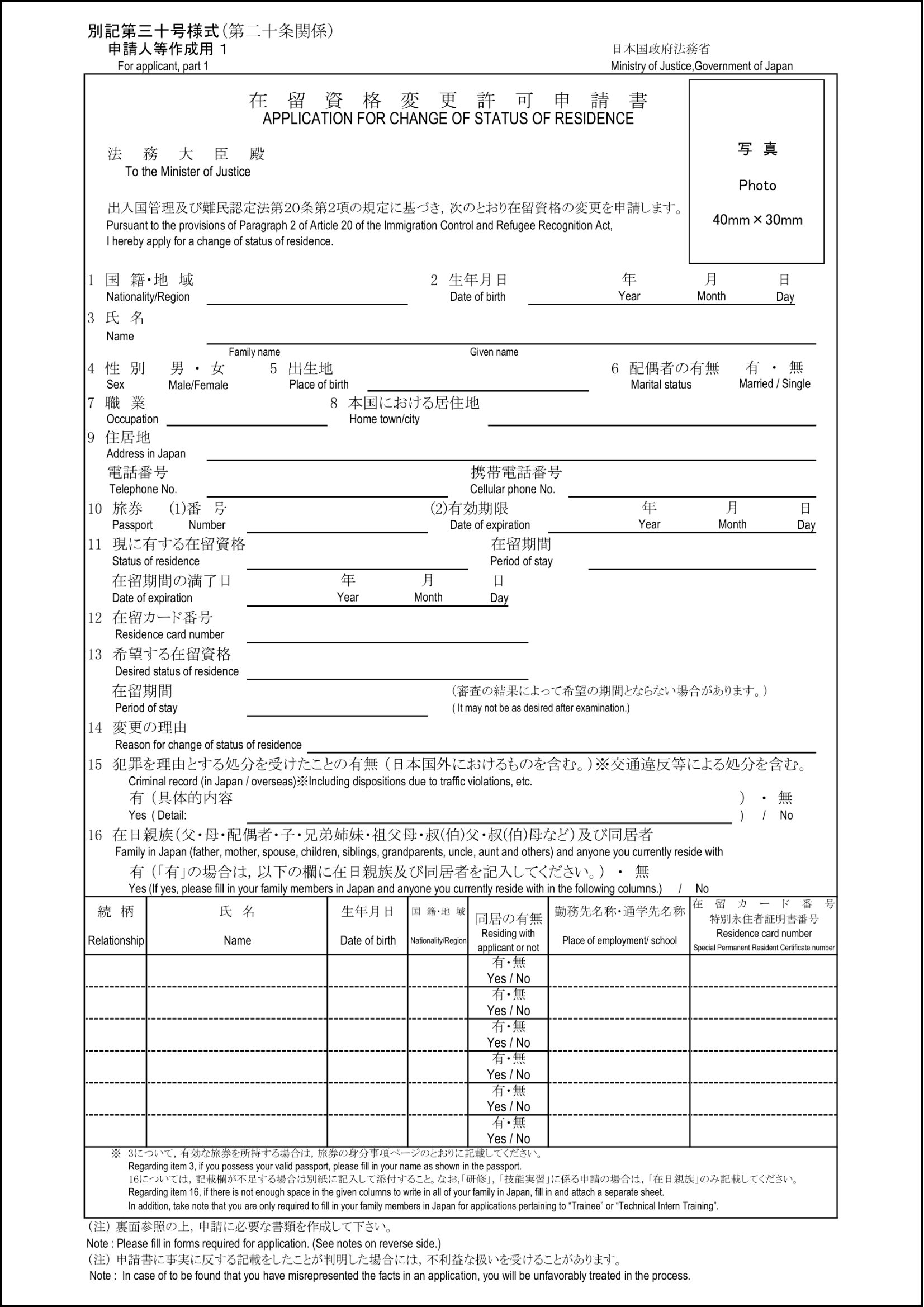 | 2 | 在留資格変更許可申請書 1部 |