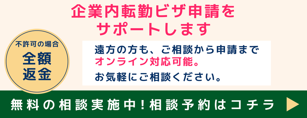 日本滞在中には生活に様々な変化が発生しますが、そんなときに当事務所のような企業内転勤ビザの専門家にご相談いただくことで、解決できることも多くありますので、ぜひご活用ください。