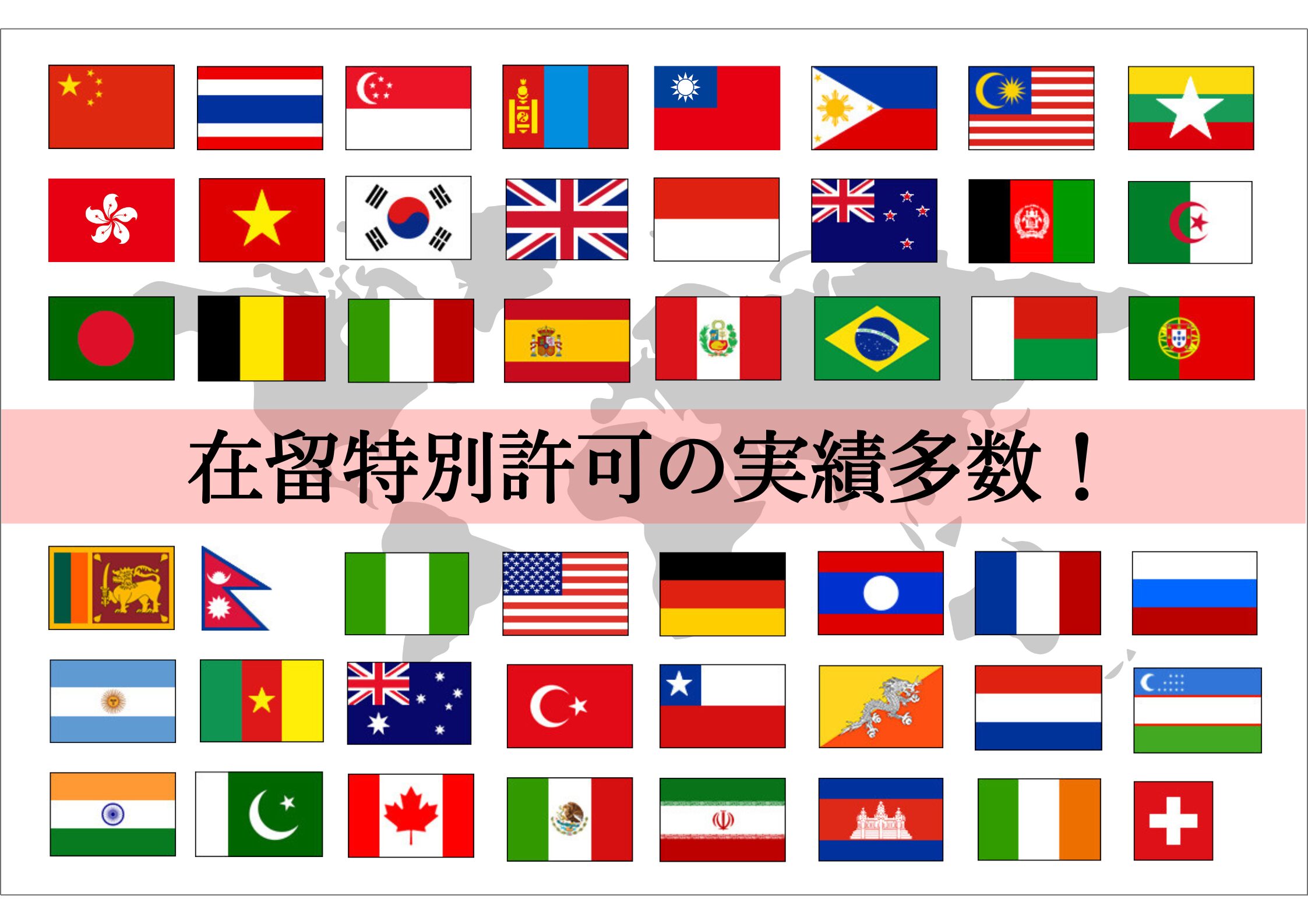 国際業務に特化し業務を行ってきたため、アジア、ヨーロッパ、北中米、南米、アフリカ、オセアニアなど豊富な実績がございます。これまでにたくさんの在留特別許可申請を行ってきたため、全国トップレベルのノウハウを持ち合わせています。